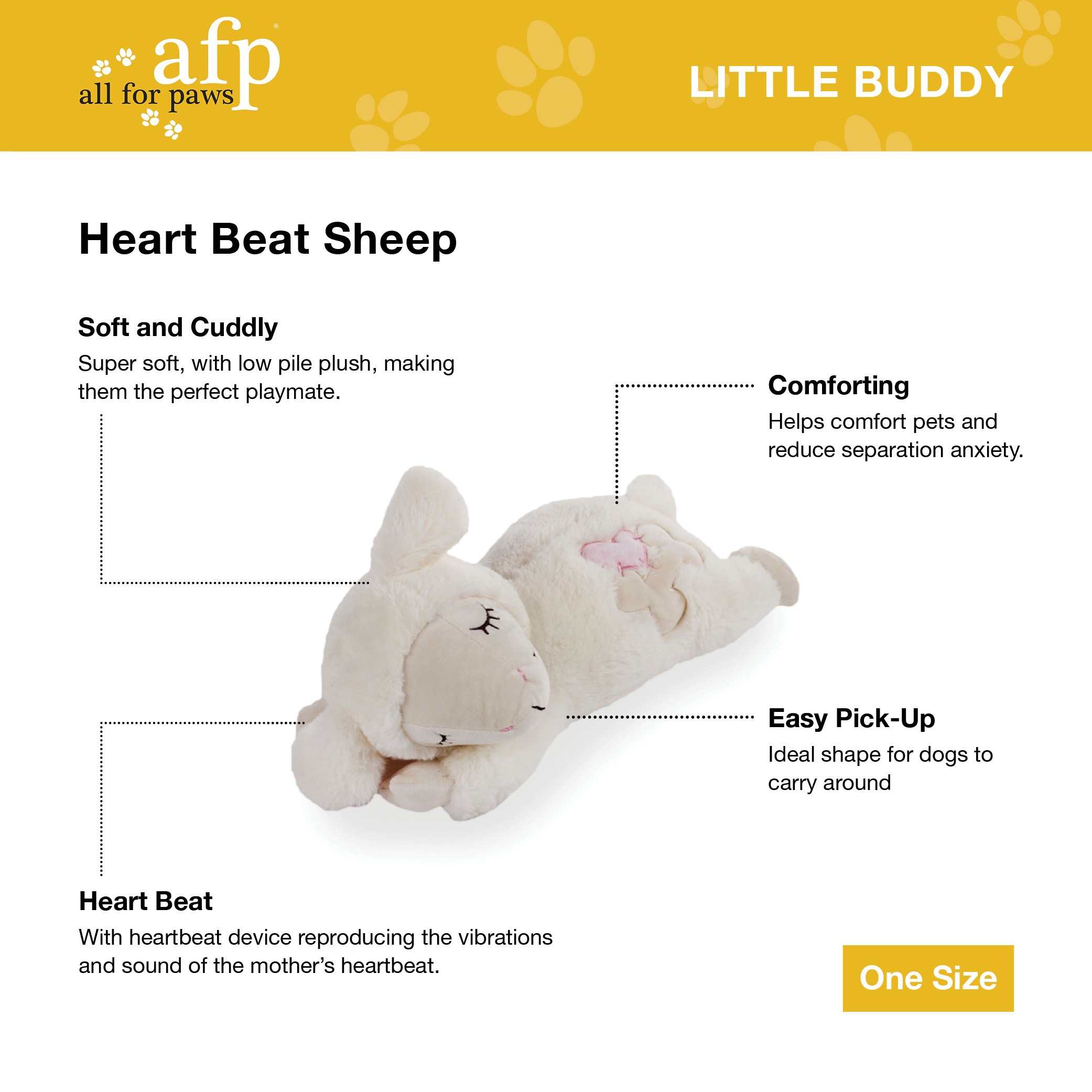 Worried your furry friend is going to be lonely without you? This is the perfect toy for you. The AFP Heart Beat Sheep is soft and cuddly and has a heartbeat device located inside a velco pocket. This device reproduces the vibrations and sounds of a mother’s heartbeat. This will help to comfort your dog and reduce their seperation anxiety. It is the perfect shape for dogs to hold in their mouth and carry around. It works with AA batteries (not included).