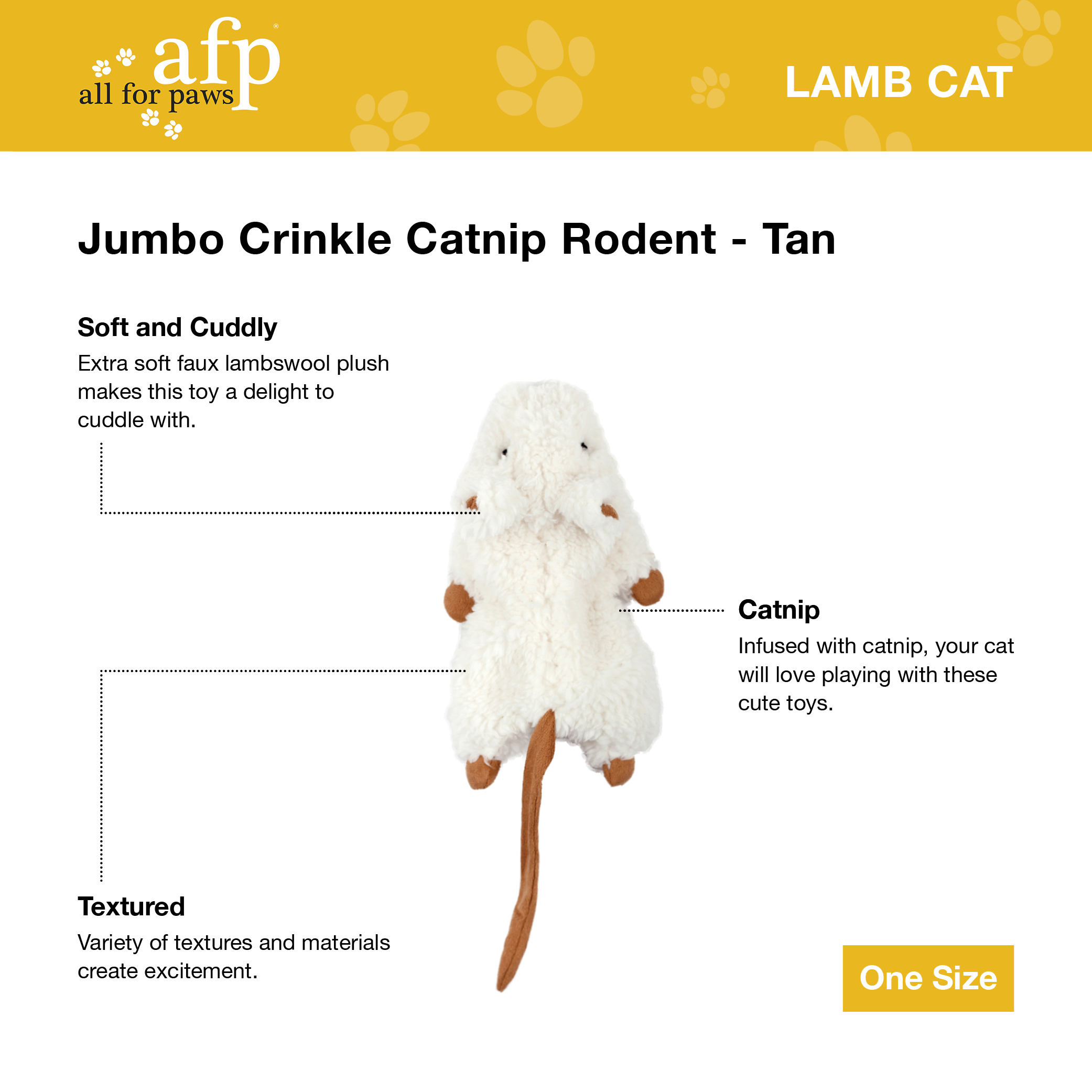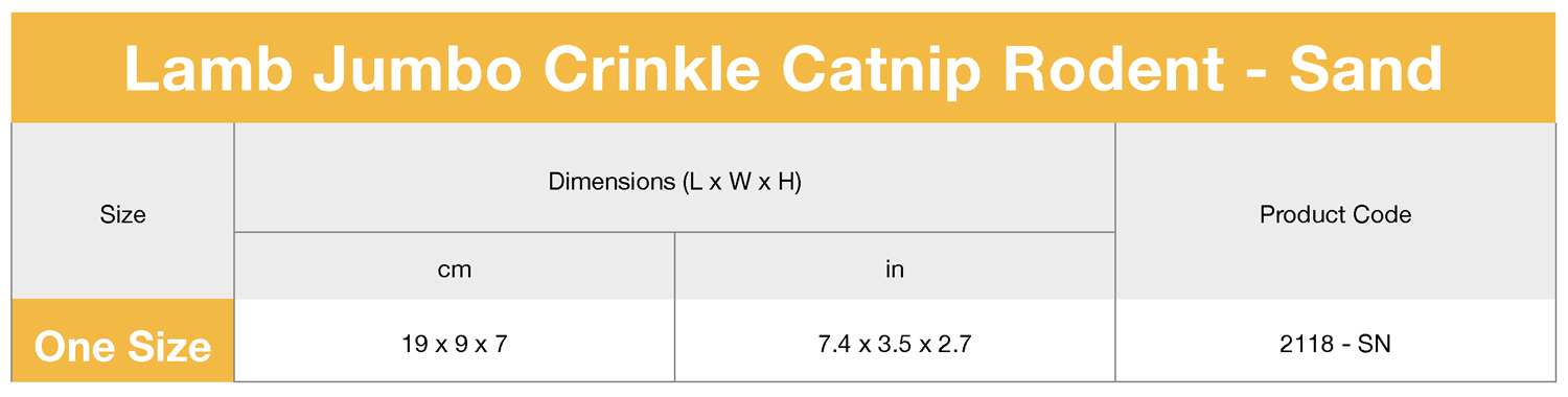 This Lambswool inspired toy is soft, cuddly and is a timeless style while still fun to play with. Your cat will love the faux wooly texture and the look of the toy will fit into every household. The Jumbo Crinkle Catnip Rodent is filled with Catnip and will be your cats favourite toy.