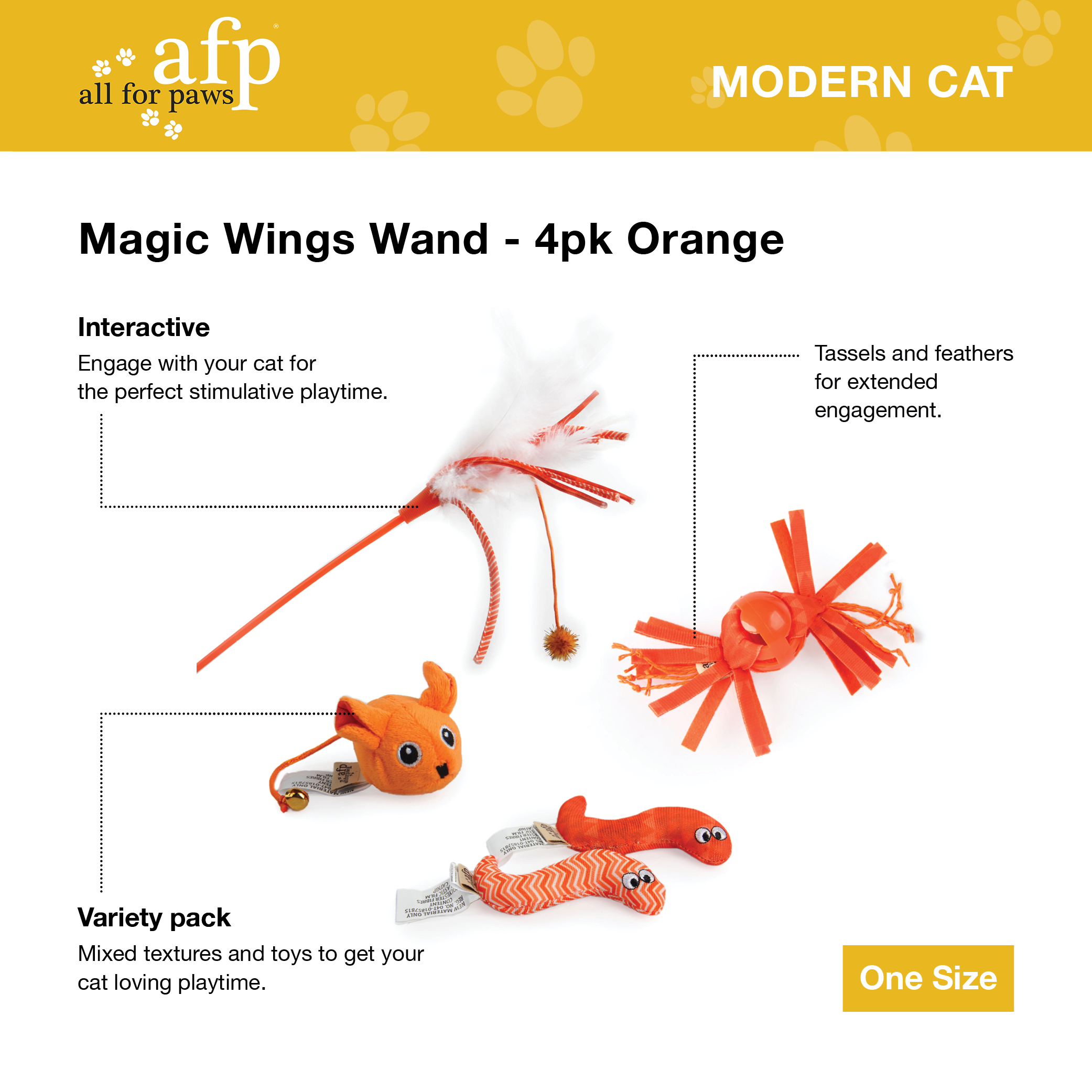The Modern Cat range is modern, trendy and colourful. Like humans, pets can also get bored by routine so this range is sure to provide your cat with something new and exciting. The Magic Wings Wand has four pieces in the pack and you can keep your cat entertained with the feather wand, tassle ball, worms and jingle bell tail mouse.