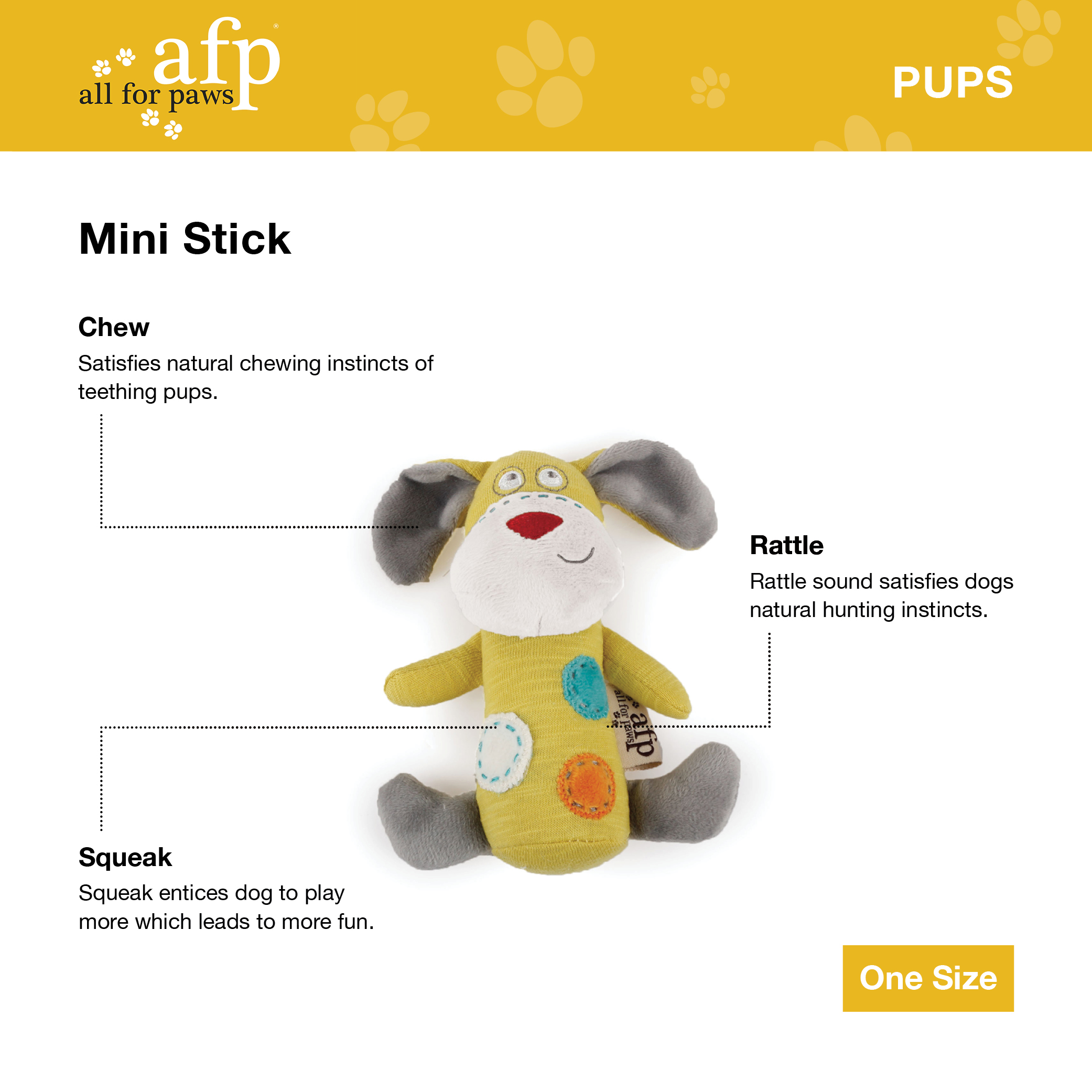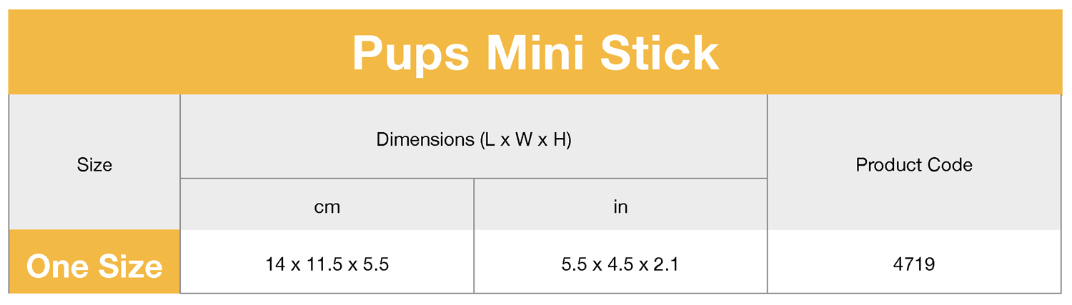 The Pups Mini Stick is the perfect bite size for your puppy and the rattle inside this toy will spark your dogs interest for hours.