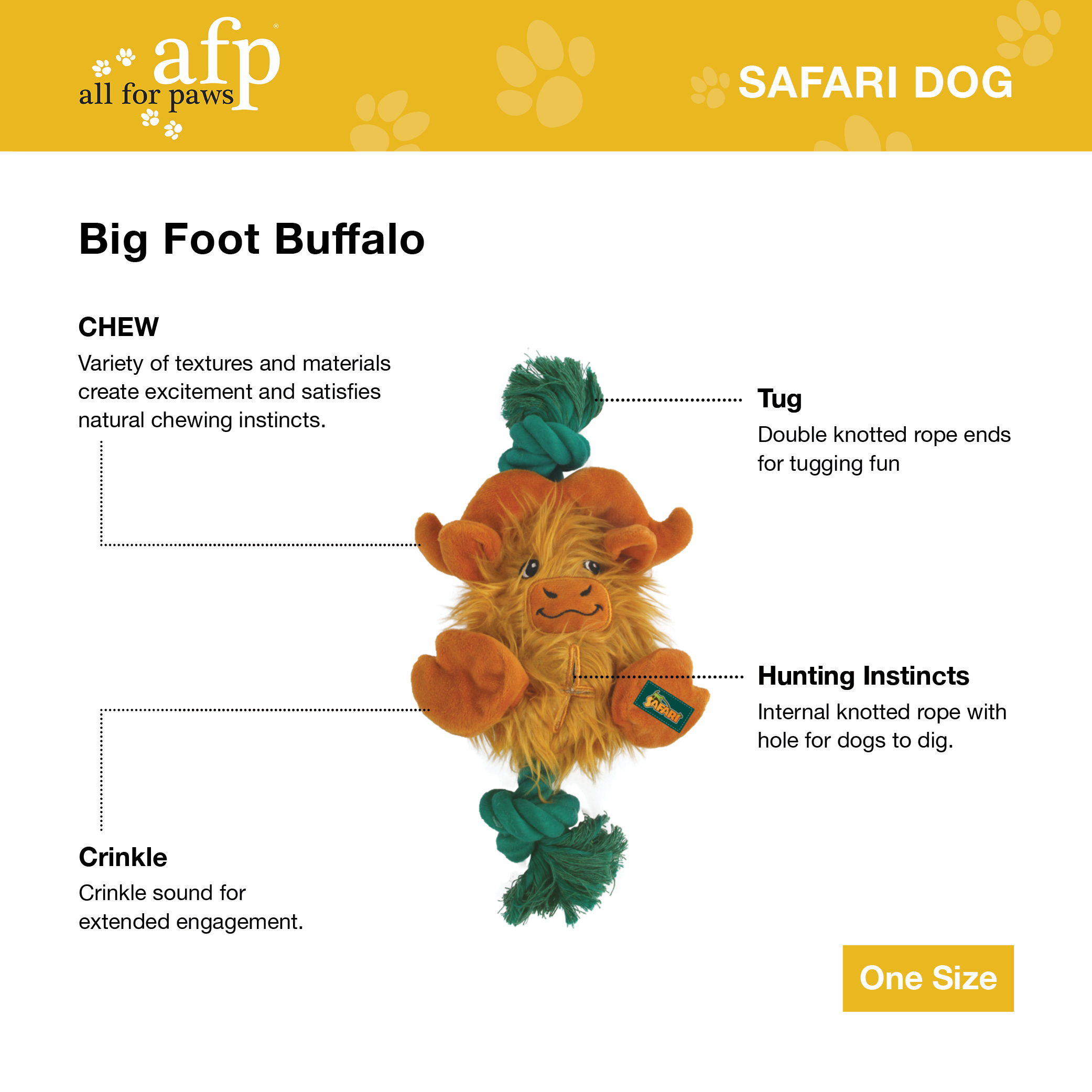 This knotted plush toy is a great tug toy for you pet to engage in solo play or to play with you. The knotted rope on both ends allows for tug fun, while the hole in the middle allows for the dog to dig at the internal knotted rope and satisfy their natural chewing instincts. This cute Big Foot Buffalo is made of a variety of materials and textures to create additional excitement.