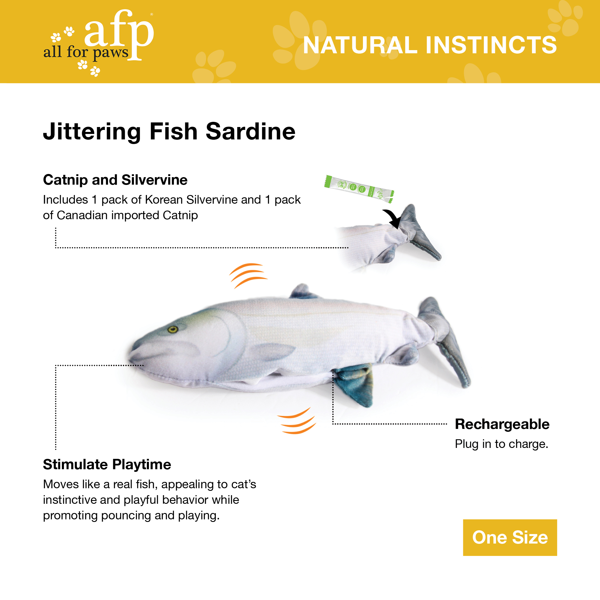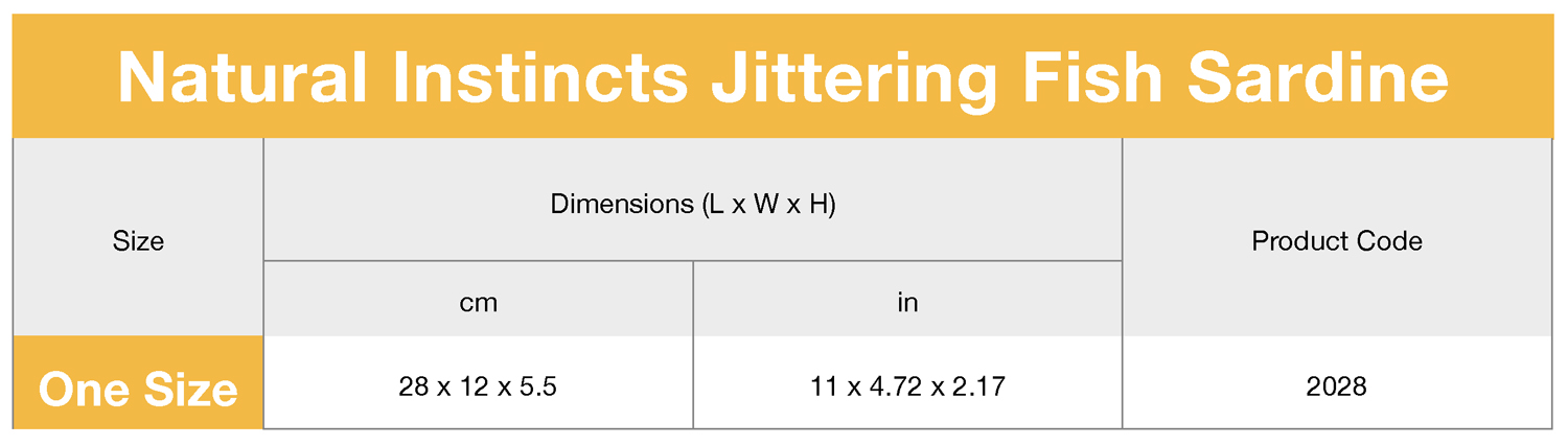 The Jittering Fish Sardine will appeal to your cat’s natural instincts and promote pouncing and playing behaviours. This toy will contribute to your cat’s physical and mental health and and will contribute to their daily exercise.