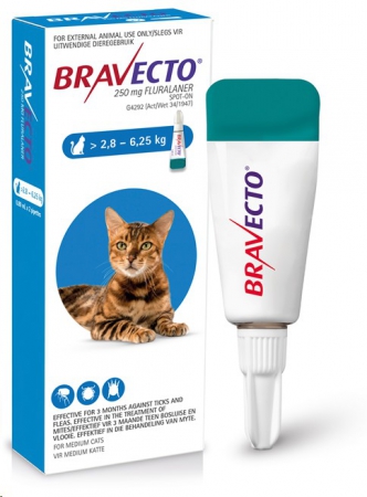 A Spot-On product for the treatment and prevention of tick, flea and mite infestations in dogs and cats. In cats, Bravecto® Spot-On provides immediate and persistent flea and tick activity for 3 months.