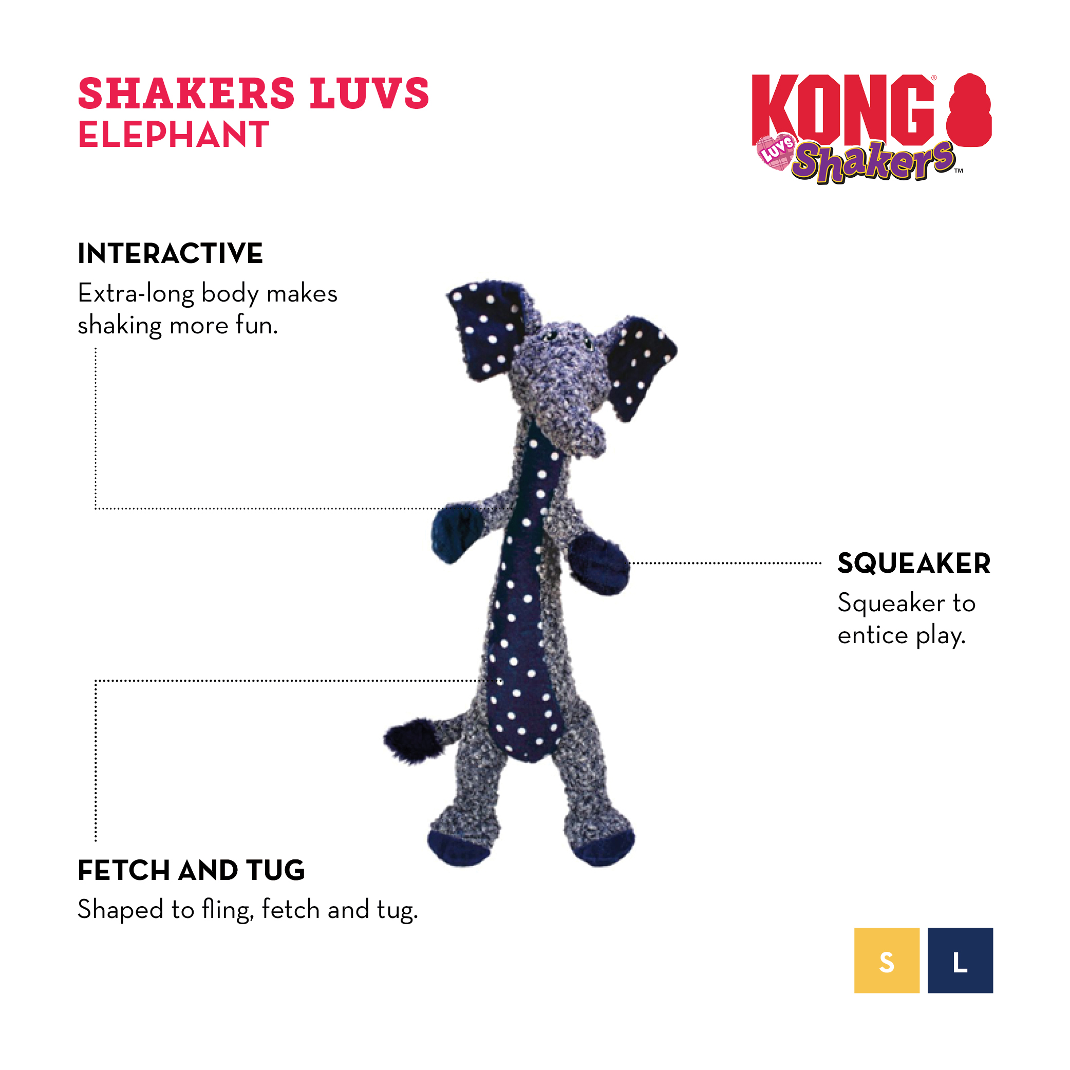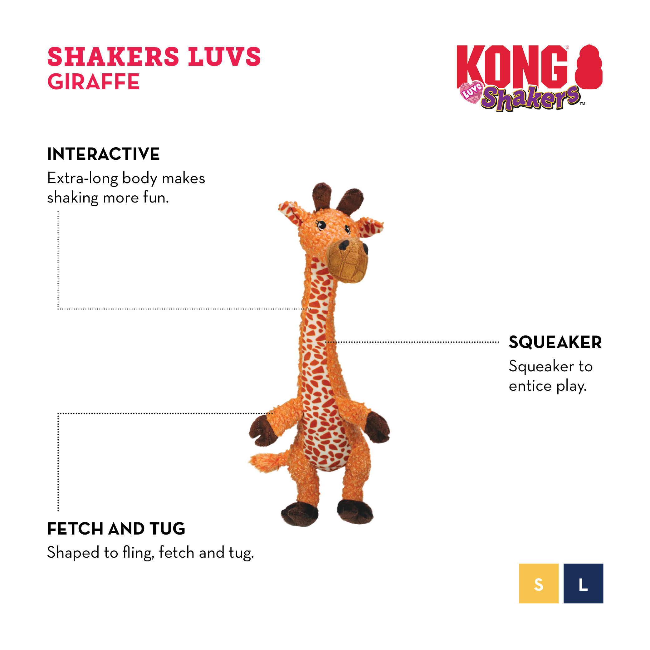 KONG Shakers Luv’s has a unique extended body with arms wide open for frolicking rounds of tug, toss and fetch. Its extended body is long on fun making it great for shaking and flopping while a low-toned squeaker sparks natural instincts and prolongs playtime.